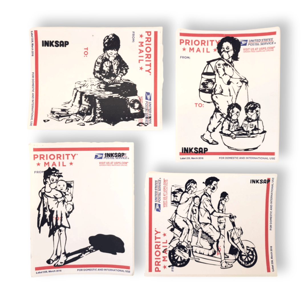 package of stickers -USPS Postal set Boy folding / Woman, kids and tree / Girl and Baby / Refugee vacation / Quynh trekking . FREE SHIPPING ANYWHERE IN USA.